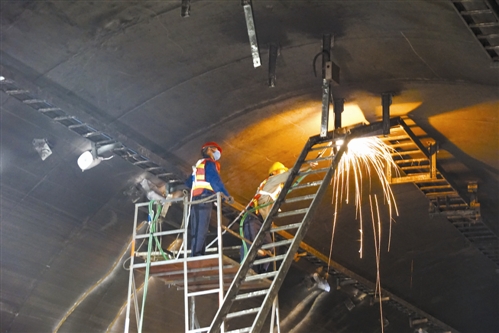 另一處作業(yè)面,負(fù)責(zé)焊接的王師傅拿著器械,正目不轉(zhuǎn)睛地盯著焊接面。“焊接對精度技術(shù)要求很高,焊縫還要檢測,得一次成型,否則施工就不合格。”從事多年電焊工的他常常腰酸腿疼,落下“身疾”,“不過時間久了也就習(xí)慣了,堅持就是勝利。”王師傅依然很樂觀地看待自己的工作。