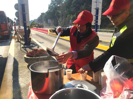 當天是入冬以來最冷的一天,收費崗亭周圍氣溫達到零下4度。該所員工身穿耀眼的“紅馬甲”,面帶微笑,在車道安全島內搭起臨時“便民服務臺”,頂著嚴寒為過往司乘人員遞上一杯杯滾燙的姜茶與紅豆湯,并提醒司機朋友天冷注意保暖。