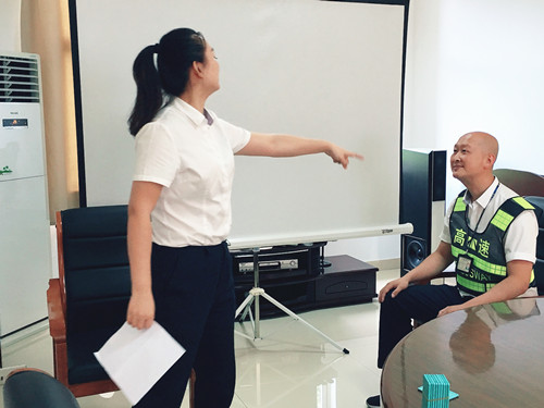 此次培訓一改枯燥乏味的傳統形式,工作人員結合平時窗口實際工作,分別擔任角色扮演,生動而又形象地演繹窗口服務,真實地反映出收費員在收費過程中遇到的各類情景。比如:ETC車道無法正常通過、遇堵車分流、駕駛員情緒激動、綠農車混裝未達到免費、入口如何勸離超限車輛等各類突發事件應急處理辦法。