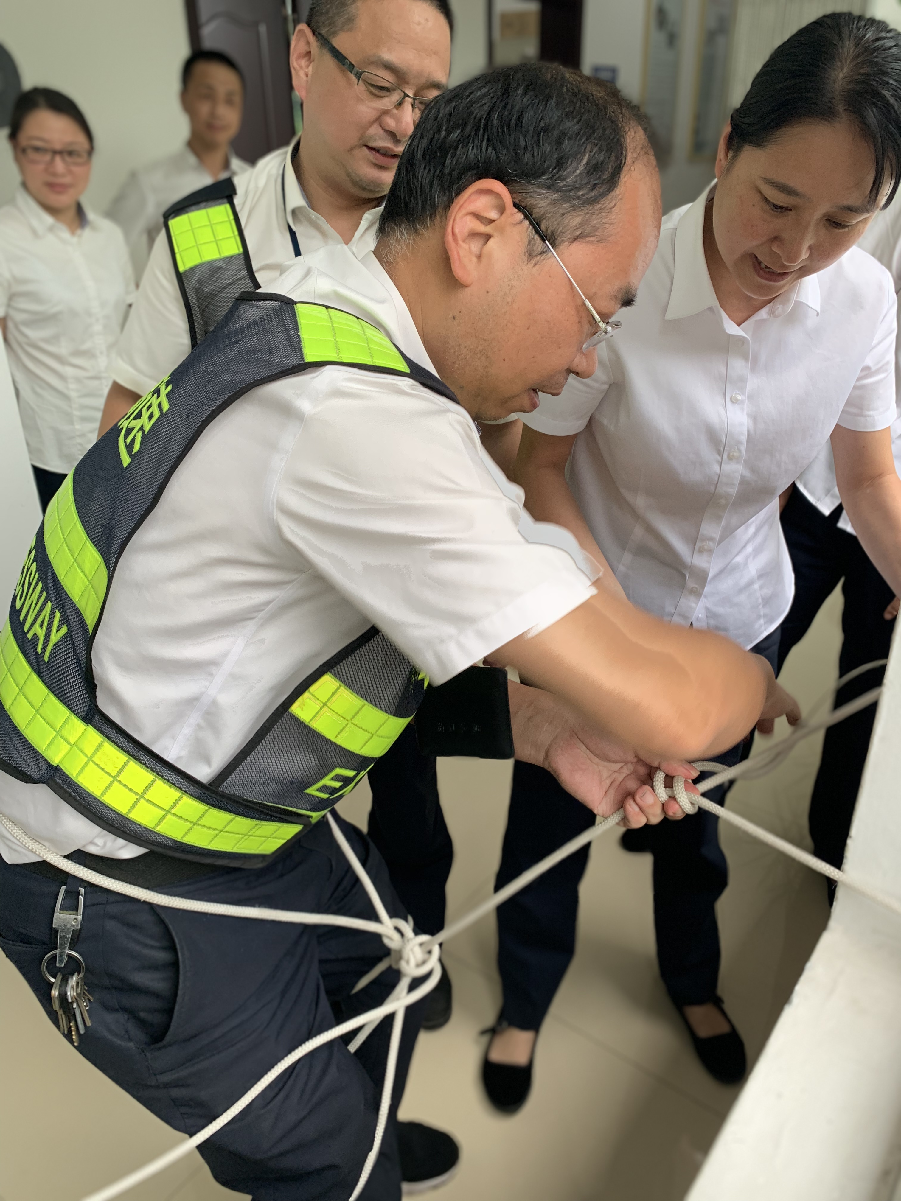 “繩”采飛揚(yáng) ——記臨海南收費(fèi)所逃生繩技能大比武活動 “加油、加油!” “快快快,繩子給我,輪到我啦!” “不對不對,繞三圈從中間穿過去!” 臨海南收費(fèi)所辦公樓二樓樓道上,不時傳出陣陣掌聲、吶喊聲,7月15日至7月17日,該所以各收費(fèi)班組為參賽單位,以“增強(qiáng)消防安全意識,提升應(yīng)急逃生技能”為主題,開展逃生繩技能大比武活動。