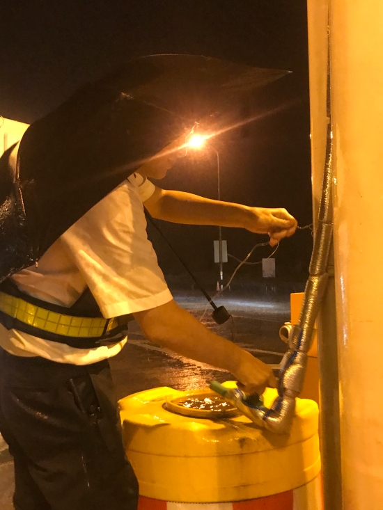 8月10日凌晨1點05分,為了安全起見,集團副總經理章海峰帶領所長助理周戰、辦公室毛宇航、安保部陳科、機電維養中心何小敏等人捆扎崗亭被風吹散的收費設施。所務駕駛員徐海順駕駛皮卡車將崗亭人員分批撤離。收費班長成守村在人員全部安全撤離后還未離開,直到重新檢查發現無異后才冒雨返回辦公樓。