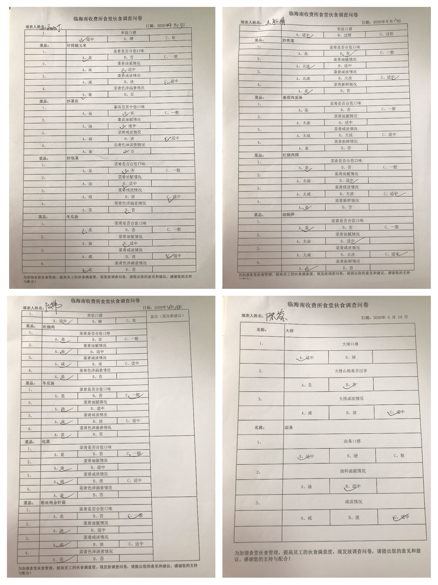 圖為伙食調查表 為了提高食堂滿意度,該所從菜肴口味、油膩度、咸淡、色澤等方面制定調查問卷,讓大家真實客觀地表達各自的想法和建議。問卷調查采用當班用餐人員實名填寫問卷調查表的形式進行,通過收集的問卷,每天中午定期召集食堂人員,反饋前一天的調查結果,根據員工的反饋建議,討論制定整改措施,確保將員工的意見及建議落到實處。除此之外,每逢傳統佳節,定制相應的節日菜譜,保證員工在站所也能感受到節日的喜慶和家的溫馨。 通過一個月的實施反饋來看,總體結果比較滿意。兩位廚師也都表示,今后要努力改善菜肴質量和服務水平,嚴把食堂飲食安全關,提高食堂各項工作的質量,經常性地與員工溝通,力爭讓每位員工滿意,做員工放心食堂。