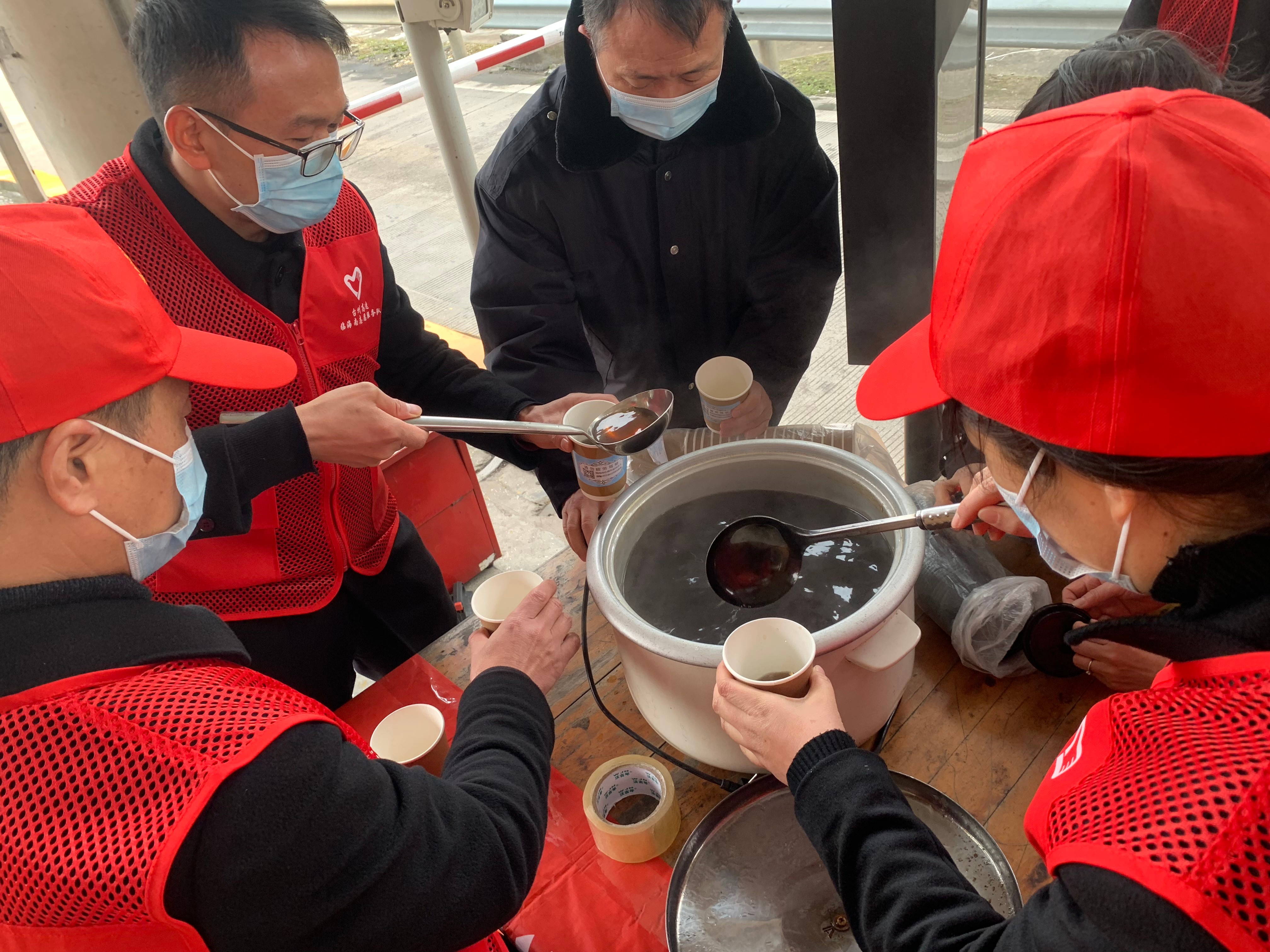 為了開展好本次活動,收費(fèi)所黨支部提前一天就進(jìn)行了布置,力求在做好疫情防控的同時開展好志愿服務(wù)活動。 當(dāng)天上午,收費(fèi)所食堂預(yù)先熬制好滿滿一大鍋紅棗姜茶,伴隨著鵝毛大雪,車道寒風(fēng)凜冽,但刺骨的寒風(fēng)擋不住志愿者們的似火熱情,大家身穿紅馬甲,面帶口罩,在搭好志愿服務(wù)臺后,有的負(fù)責(zé)用勺子把滾燙的茶水裝進(jìn)紙杯,有的負(fù)責(zé)蓋杯蓋,有的負(fù)責(zé)傳遞,有的負(fù)責(zé)把裝好茶水的杯子送給駕駛員,現(xiàn)場有序分工。熱情的服務(wù)贏得過往司乘人員的好評。