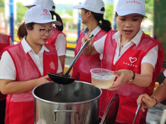 圖為志愿者分裝飲品