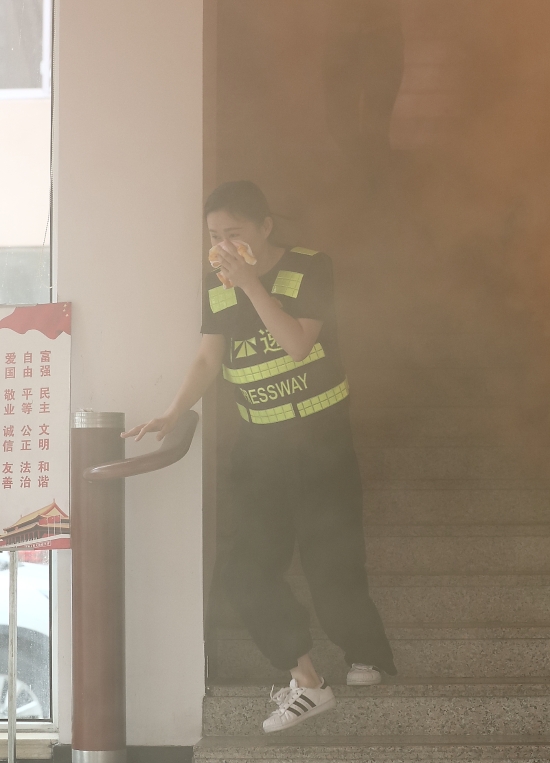 講座結束后,該所隨即開展火災逃生演練。員工發現火情立即撥打報警電話,參加演練人員聽到警報聲后,迅速拿起打濕的毛巾捂住口鼻,按照正確逃生動作要領,從樓上彎腰低姿扶墻往樓下跑,大家有序疏散至安全地帶。