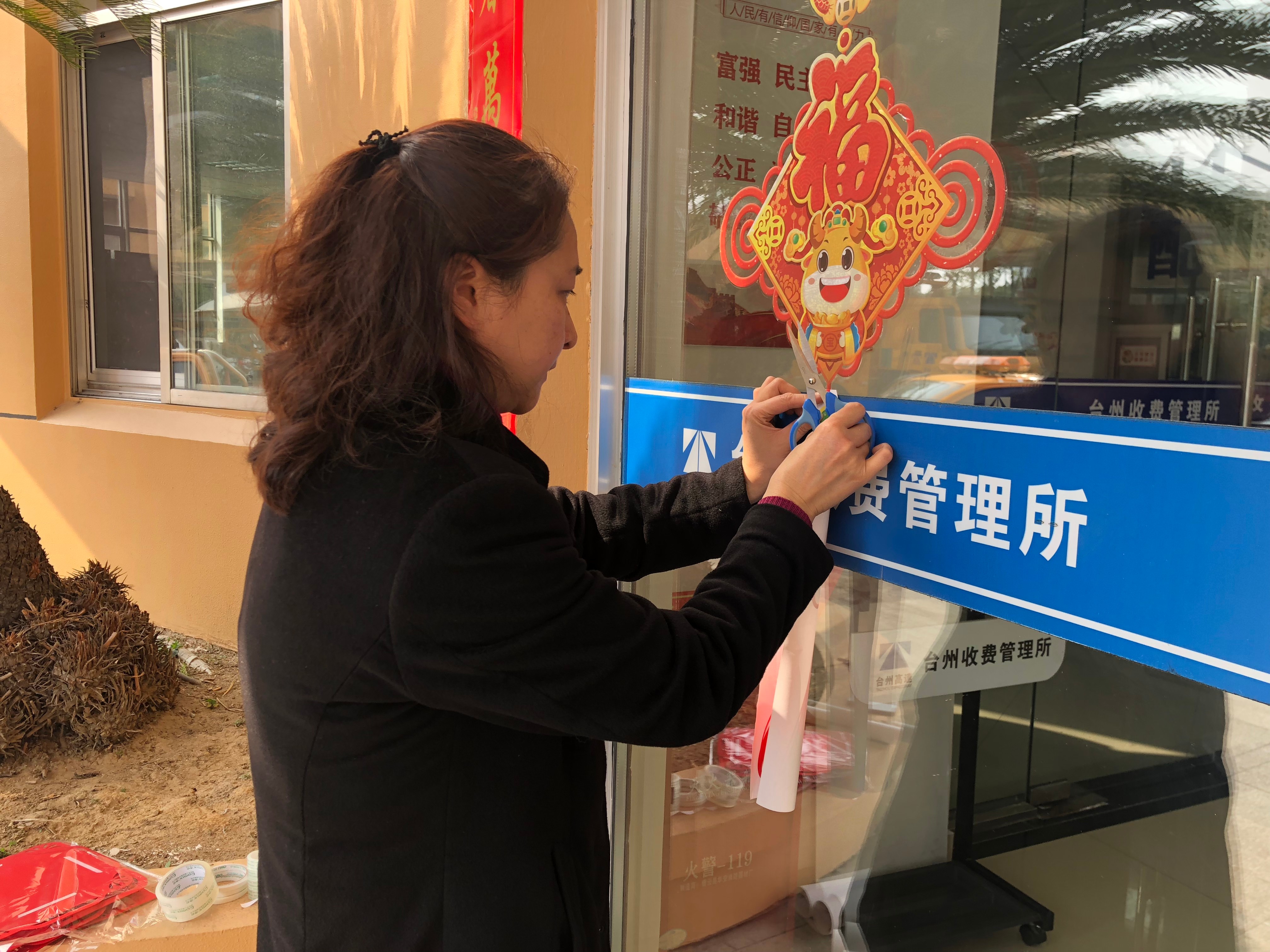 27日,臺州收費所員工給站所添點“味兒”。大家分工合作掛燈籠、貼對聯、貼窗花、插彩旗……一盞盞大紅燈籠高高掛起,一幅幅新春對聯溫暖門房,一張張精致窗花鑲嵌窗上,一面面五彩旗幟舞動廣場,整個收費所充滿了新年的味道,溫馨祥和。