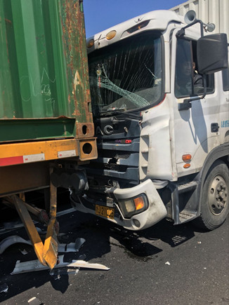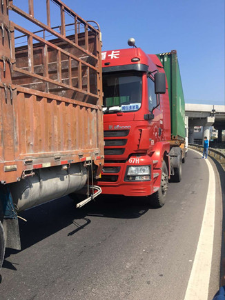 當天中午,在副站崗亭旁站的工作人員發現該所前方出口不遠處有貨車停在那里不動,以致后面車輛無法通行。工作人員隨即跑到前方查看情況,原來是三輛貨車發生追尾,其中有一輛車車頭被撞得凹陷,擋風玻璃也被撞碎,在了解事故現場無人員受傷后,工作人員馬上向監控中心匯報情況。由于事故車輛較大面積滯留,導致后方車子堵到主線上,一些不明情況的駕駛員在車里使勁按喇叭催促,現場充滿焦躁情緒。