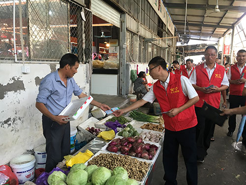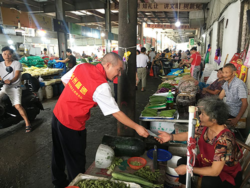 圖為志愿者在菜場(chǎng)宣傳垃圾分類(lèi) 志愿者們特地選取菜市場(chǎng)、商鋪等人多且容易產(chǎn)生垃圾的地方,向店主和商販們宣講環(huán)境公害引發(fā)的負(fù)面后果及如何處理平時(shí)的生活垃圾,他們結(jié)合宣傳冊(cè)通俗、耐心地講解生活垃圾要從源頭開(kāi)始分類(lèi)投放:干濕要分開(kāi),對(duì)剩菜剩飯、瓜皮果殼等易腐垃圾要瀝干水分,投放后要蓋好垃圾桶,免得蚊蠅滋生;紙類(lèi)、飲料瓶、金屬等有再生利用價(jià)值的要放在可回收的垃圾桶里;對(duì)電池、電子產(chǎn)品、殺蟲(chóng)劑、油漆桶等含有害化學(xué)物質(zhì)的要單獨(dú)放;剩余的作其它垃圾處理。