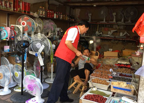 圖為志愿者向小商鋪店主宣傳垃圾分類(lèi)