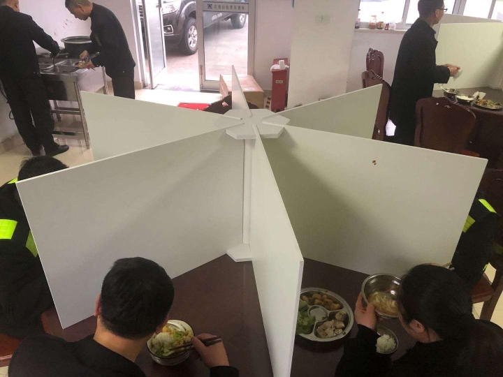 這是疫情期間,為了員工的安全健康,讓員工吃上安心餐,該所對餐桌進行布局,將餐桌用塑料擋板隔成六個區(qū)域,員工在每個區(qū)域內用餐,這樣可以避免就餐說話,減少相互間的交流。這是該所做好疫情防護的一項新舉措。
