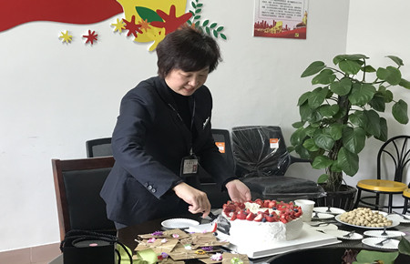 圖為陶秀英同志在歡送會現(xiàn)場切蛋糕 歡送會上,章海峰代表臺州高速,對陶秀英同志二十余年如一日為集團發(fā)展所付出的辛勞和貢獻表示了衷心感謝,預祝她退休生活豐富多彩,也希望她退而不休,常回“家”看看。同時號召年輕員工學習陶秀英身上傳承勤勤懇懇、認真踏實的態(tài)度與精神,為征費管理共努力,為集團發(fā)展共拼搏。