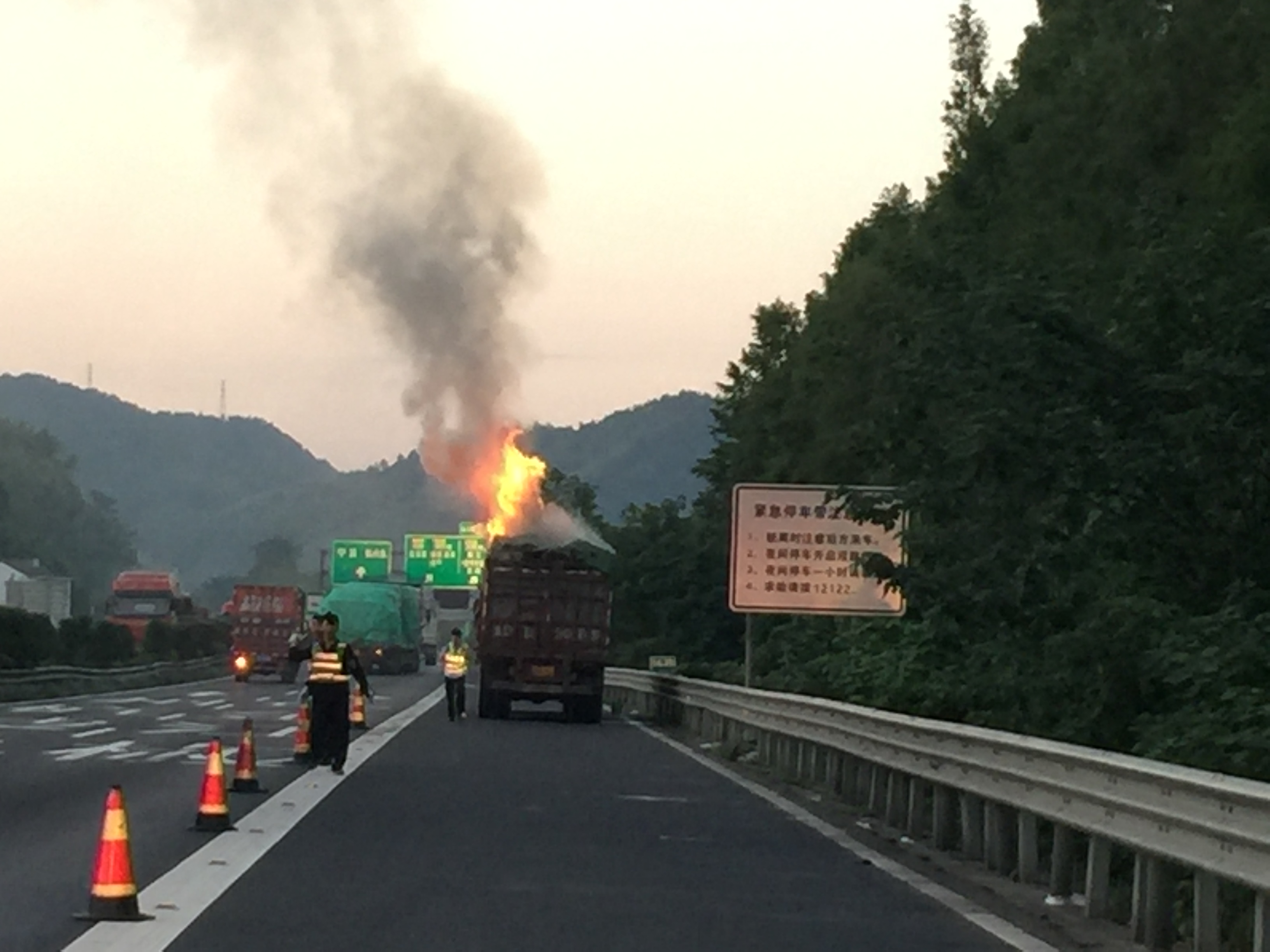 圖為事故現場 險情就是命令,黃土嶺隧道所執勤隊立即啟動火災應急預案,迅速帶著滅火器趕赴現場。事故現場,貨車車頂冒著火光,而且火勢越來越大,滅火器根本不可能撲滅大火。執勤隊又迅速設置好安全警示標志,配合交警人員實施臨時交通管制,并對事故路段的車輛進行分流疏導。