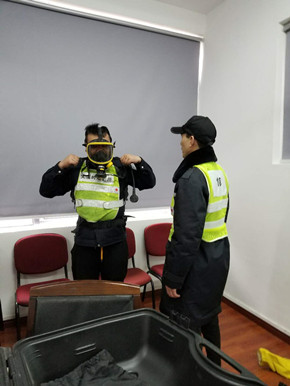 培訓中,陶文輝講解了“高速隧道火災特點”及呼吸器、防化服的使用方法及相關要求。話題開啟后,隊員們紛紛參與討論,爭相發言,講述各自在隧道事故處理中施救和應對的經歷與心得,交流平日巡查中所需注意的事項,互相提醒工作中的不足,并針對實際問題提出了許多建設性意見。同時,在主講人的現場演示下,參訓人員逐個“以身試法”,進一步熟悉和掌握了防毒面罩的穿戴方法。