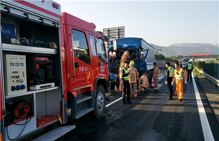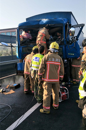 4月19日上午6點(diǎn)10分,寧向大溪出口正在進(jìn)行分流,所有車輛正緩慢前行中,一輛贛F38***牌照的藍(lán)色大貨車顯然還沒(méi)有適應(yīng)這分流的節(jié)奏,“砰”地一聲猛然撞上了前面的大貨車。 兩個(gè)“大家伙”碰撞的威力非同小可,直接的后果就是后車的車頭變形,損傷極大,貨車駕駛員被卡在車頭里出不來(lái)。 時(shí)間就是生命,施救中心迅速出動(dòng),配合交警、消防部門在現(xiàn)場(chǎng)進(jìn)行預(yù)警,并協(xié)助進(jìn)行事故處理。