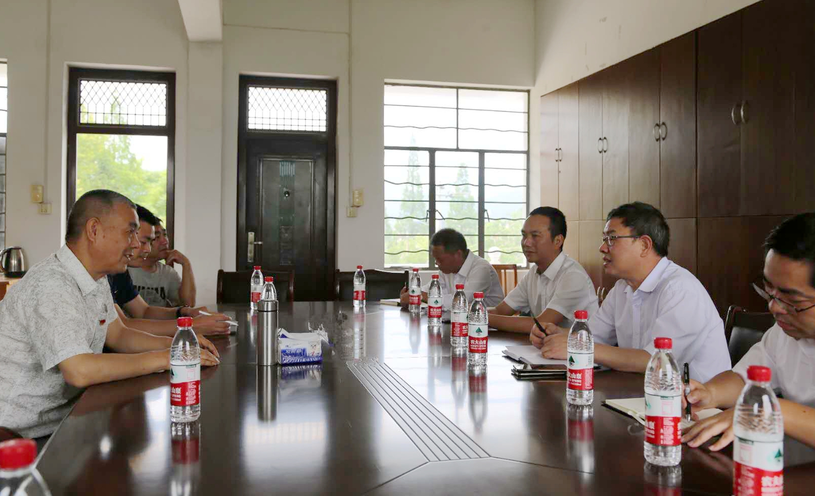 圖為陳文波與村兩委班子以及駐村指導(dǎo)員座談交流 在塘上村的村委會會議室里,陳文波與村兩委班子以及駐村指導(dǎo)員進(jìn)行座談交流。塘上村村支書、村長,以及其他村干部分別向陳文波等介紹了村里近期的基礎(chǔ)設(shè)施建設(shè)、村民生產(chǎn)生活、產(chǎn)業(yè)扶貧措施、文化禮堂建設(shè)等工作中的重點(diǎn)難點(diǎn)問題,同時代表村民感謝臺州高速集團(tuán)長期以來對塘上村的支持和幫助。