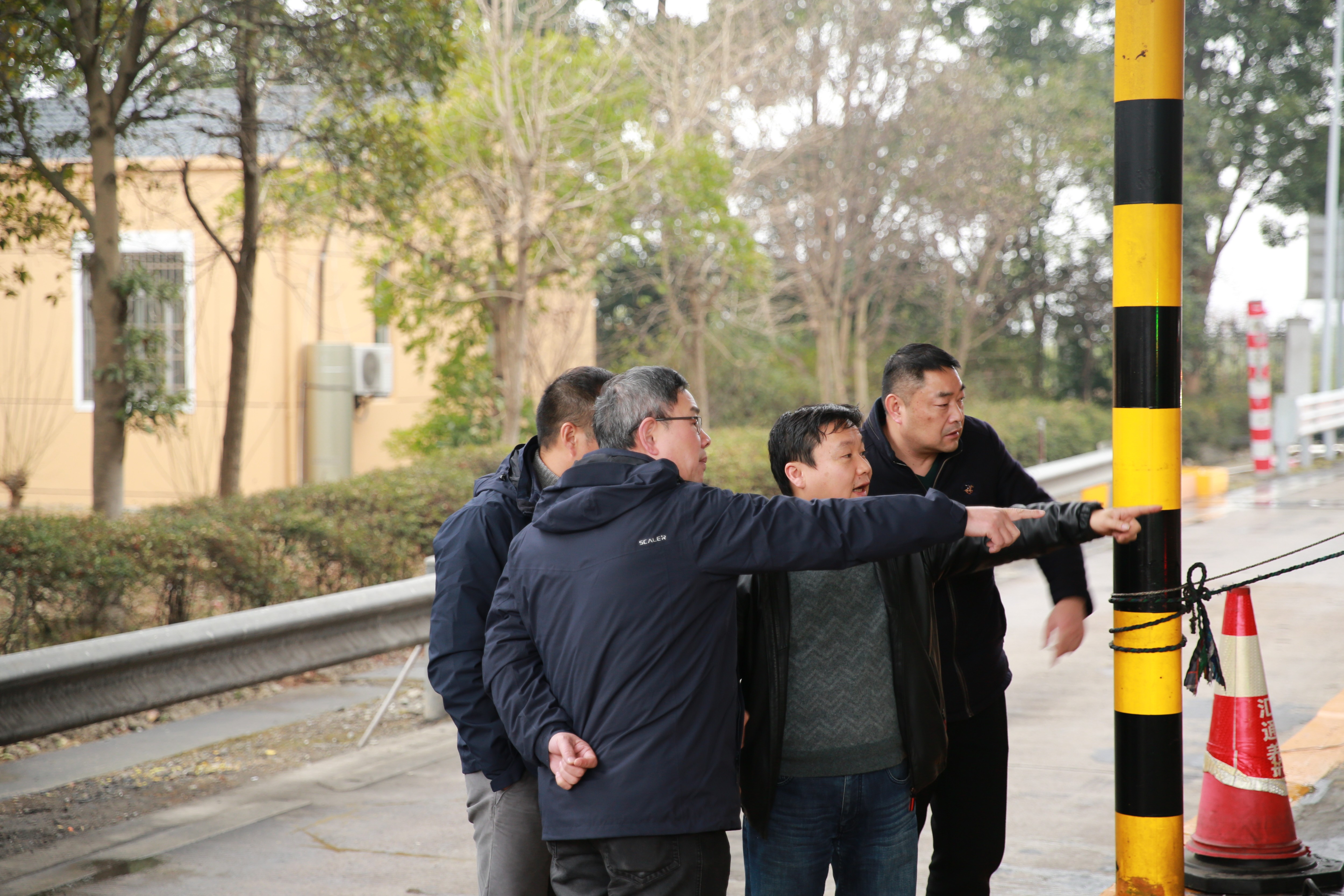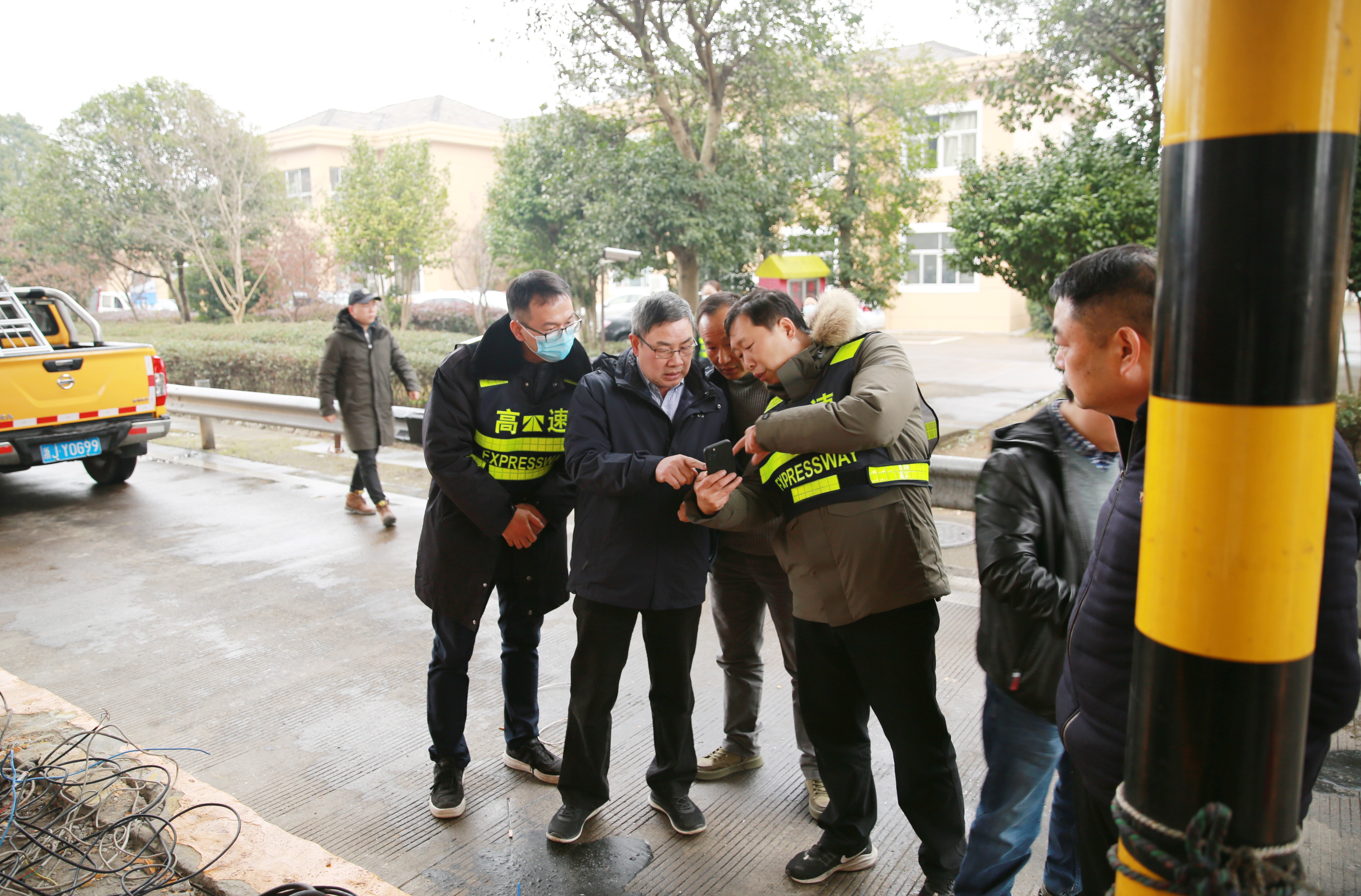 1月20日下午,臺(tái)州高速集團(tuán)黨委書(shū)記、董事長(zhǎng)、總經(jīng)理陳文波趕往臨海南收費(fèi)所,現(xiàn)場(chǎng)指導(dǎo)1月19日深夜大貨車(chē)撞倒收費(fèi)崗?fù)さ暮罄m(xù)維修工作。集團(tuán)副總經(jīng)理章海峰,工程養(yǎng)護(hù)部、安保部負(fù)責(zé)人陪同。 事發(fā)現(xiàn)場(chǎng),各種破損之物于昨晚深夜就已被清理干凈,被撞的1號(hào)崗?fù)の恢弥皇O侣懵兜母鞣N電線(xiàn),以及被截?cái)嗟姆雷仓j愇牟ㄟ叢榭船F(xiàn)場(chǎng)情況,邊同維養(yǎng)技術(shù)人員就如何加強(qiáng)收費(fèi)崗?fù)ぐ踩禂?shù)展開(kāi)商討,并提出有關(guān)建議。