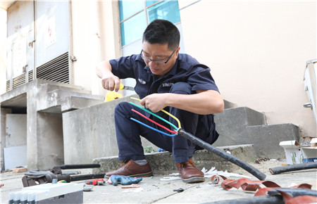 臺州收費所倉庫前方的空,電工操作的選手們一字排開,他們熟練地用電工刀,在電纜上輕輕一劃一轉,整個絕緣外殼立馬脫離,緊接著去鉛皮、掰角度、壓接頭,不到10分鐘,一根三相四線電纜接頭就此制作完成了。