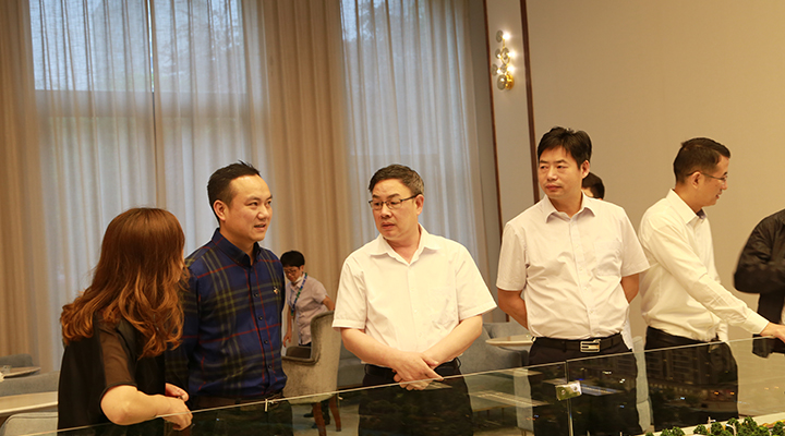 圖為陳文波等領(lǐng)導(dǎo)在沙盤(pán)前聽(tīng)取有關(guān)開(kāi)盤(pán)工作匯報(bào)