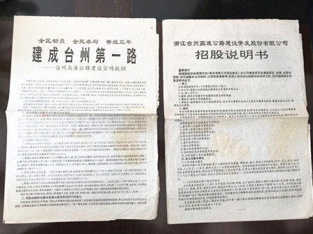 臨近中午的時候,來了一位面目普通的中年人,他準備了他父親和母親的身份證還有銀行卡,工作人員以為是兩筆代辦業務,原來是查詢股東紀錄的,查詢的股東名字叫婁巖奶,因為巖奶兩字比較少見,我記得上午的時候辦理過一個叫巖奶的股東的收購業務,就非常好奇的詢問,這時候管理處的工作人員解釋,他們這里有兩個叫巖奶的人,一個是婁巖奶,一個是宋巖奶,經過查詢卻沒有找到婁巖奶的股東信息。據管理處工作人員回憶,1993年婁巖奶當時還未退休,應該購買了股票。經過查詢管理處的退休人員清冊,發現婁巖奶于1994年12月才退休,根據初步判斷估計該股東可能當時出于各種原因并沒有購買股票。為了慎重起見,于是工作人員請求管理處把股票購買的原始檔案調閱出來查看,翻開斑駁的原始記錄,一個一個仔細查詢股東姓名,但是很遺憾并沒有該股東的信息,工作人員肯定地回復了股東。雖然讓婁巖奶的兒子失望了,但是工作人員卻在斑駁的檔案中看到了非常珍貴的歷史檔案:《全區動員、全民參與、苦戰三年、建成臺州第一路—臺州高速公路建設宣傳提綱》、《浙江臺州高速公路建設開發股份有限公司招股說明書》,看著這些檔案,眼睛有些濕潤,仿佛又回到了那個波瀾壯闊的年代,也為高速集團曾經的創舉而驕傲。
