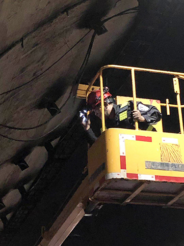圖為各方人員集聚商討搶修方案 黃土嶺隧道所立即啟動(dòng)應(yīng)急搶修預(yù)案,聯(lián)合高速交警、工程養(yǎng)護(hù)部、施救中心展開(kāi)緊急搶修工作?,F(xiàn)場(chǎng),各方人員集聚商討搶修方案、檢查安全措施、布置搶修作業(yè)。登高車(chē)上,黃土嶺隧道所執(zhí)勤二隊(duì)隊(duì)長(zhǎng)林朝波等一批搶修人員率先清理斷落的電纜,調(diào)整接線、緊固螺栓……各項(xiàng)工作環(huán)環(huán)緊扣,緊張而有序。