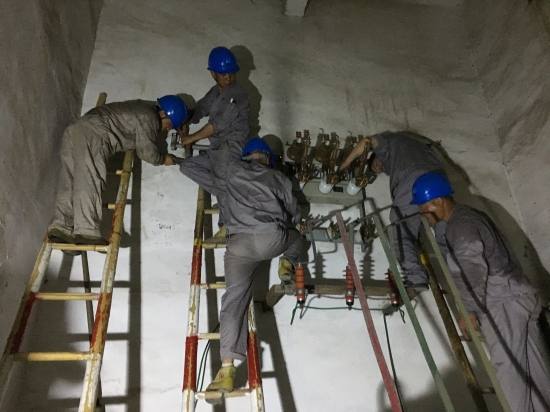 19點40分,高壓負(fù)荷開關(guān)到位。搶修人員安照各自的分工,掛接地電阻、拆卸舊件、重做高壓電纜接頭、安裝新跌落熔絲......就在大家以為快要完工時,卻發(fā)現(xiàn)新開關(guān)的聯(lián)動拉桿接口要略大于舊桿,任憑搶修人員如何用力都無法與底下操作桿連接,但大家并沒有放棄,而是用磨光機一點點打磨,一次次試驗,在損耗了兩張磨光片后終于將兩桿順利連接。之后,大家再一鼓作氣,將調(diào)試好的負(fù)荷開關(guān)固定在離地面3米之高的墻上,并成功連接電纜。