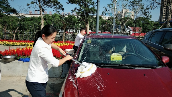 溫嶺西支部書記周超帶領黨員服務群眾 當天上午,活動一開始,前來洗車的車輛絡繹不絕。在支部書記周超的帶領下,五名黨員便開始分工合作。兩名男同志負責沖水、上泡沫、擦洗、再沖水,兩名女同志負責擦干和吸塵器清掃內室,還有一名男同志負責開車挪車,需要清洗的車輛一輛接著一輛,黨員同志們顧不得擦干身上的被水濺濕了的衣服,忙得不亦樂乎。看著被洗得一塵不染的車,大家都不約而同地會心一笑。