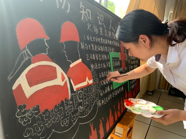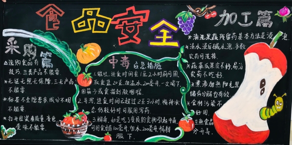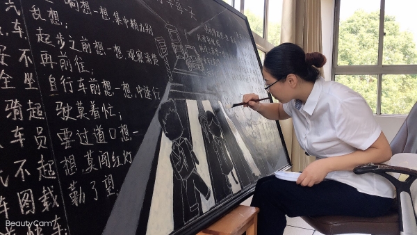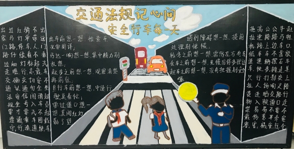 活動開展后,參與者們分配好各自的任務后出黑板報的工作便熱火朝天地展開了。大家利用自身的特長,通過粉筆字繪畫等藝術形式對黑板報進行了精心的設計,主題鮮明,內容充實,圖文并茂,趣味性強,全方位、多角度宣傳了消防安全》、《食品安全《交通安全》三大主題。其中在交通安全宣傳方面,如何使交通安全內容,更加直觀形象、簡單易懂的、眾人易于接受呢?大家通過反復嘗試,決定打破傳統模式,避免枯燥說教,交通宣傳教育知識融入兒歌中,通過朗朗上口的兒歌形式,傳達一些基本的交通規則,幫助大家養成自覺遵守交通規則的意識,提高自我安全防護能力。最后經過大家日夜趕工,黑板報的工作在大家的共同努力下順利完成