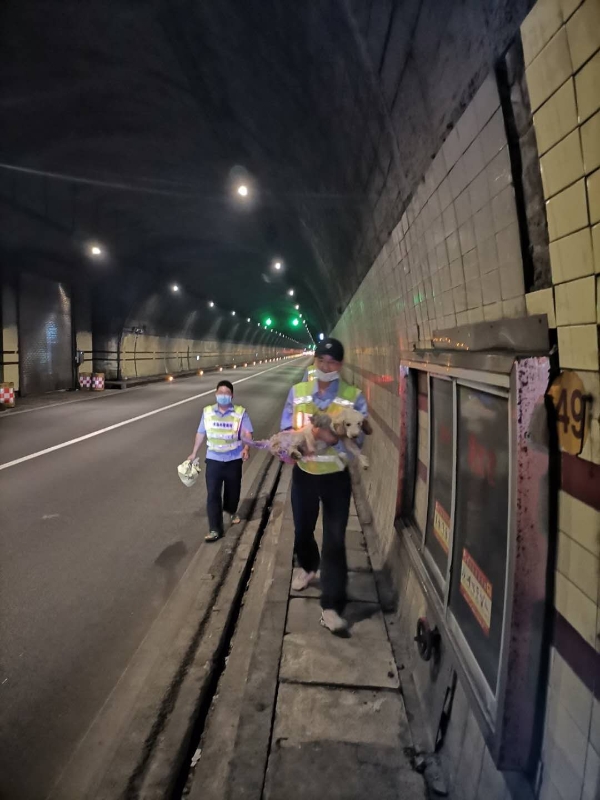 為確保安全,執(zhí)勤隊(duì)員們帶上手套,拿著掃把和麻袋,到達(dá)現(xiàn)場(chǎng)后發(fā)現(xiàn)是一只白色的拉布拉多犬,它一動(dòng)不動(dòng)地趴著,可憐巴巴地看著隧道里的車子極速而過,很顯然小狗感覺到害怕,知道趴在這里才是最安全的。隧道所安保人員陶文輝再三確認(rèn)小狗沒有攻擊意圖后,試著慢慢靠近它,給它喂食香腸,并耐心安撫,直至順利地將其抱起,帶上了巡邏車。狗是靈性的動(dòng)物,認(rèn)準(zhǔn)了第一個(gè)抱起它的陶文輝,乖乖地依偎在他的懷里。 此前,隧道里從未出現(xiàn)寵物狗被遺忘的事,執(zhí)勤隊(duì)長(zhǎng)忙回到監(jiān)控室查看錄像,準(zhǔn)備幫它尋找主人,經(jīng)過仔細(xì)查找終于發(fā)現(xiàn)隧道里有過一次大堵車,小狗就是那個(gè)時(shí)候被主人遺忘的。按照時(shí)間推算,這條小狗已經(jīng)在隧道里呆了近14個(gè)小時(shí),還好它聰明,趴在那兒一動(dòng)不動(dòng)沒有到處亂跑。最后經(jīng)過半個(gè)多小時(shí)的查找,隊(duì)長(zhǎng)終于與車主取得聯(lián)系,晚上22點(diǎn)左右,車主來到大溪嶺隧道所認(rèn)領(lǐng),多次感謝我們對(duì)小狗的救援和照顧。 孫鵬