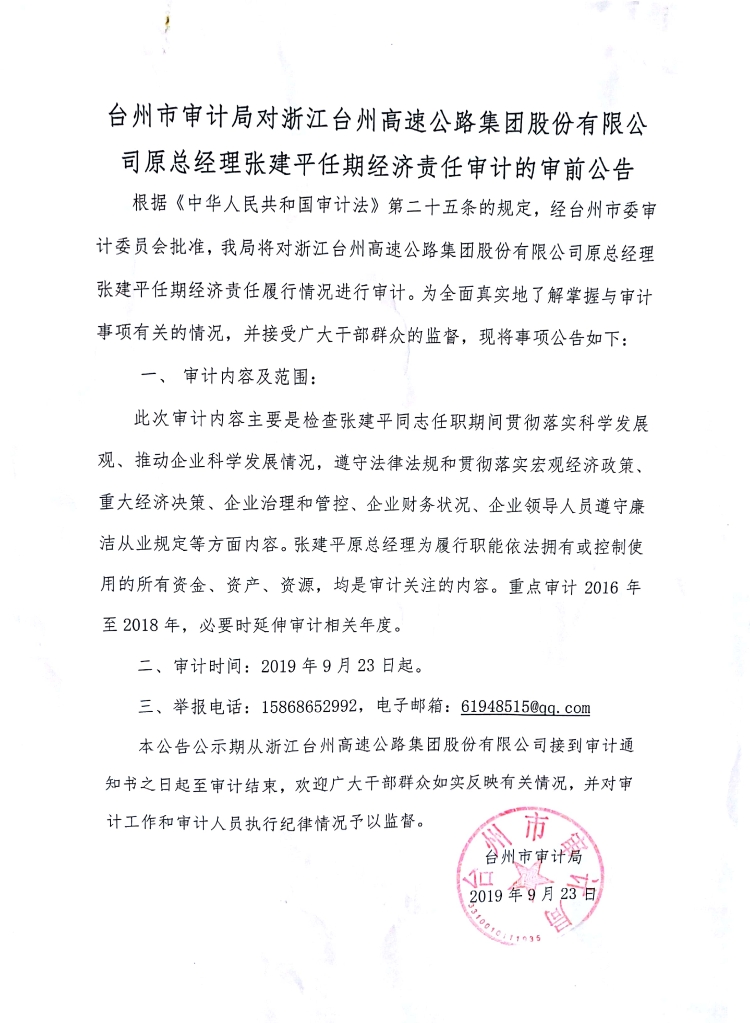 臺(tái)州市審計(jì)局對浙江臺(tái)州高速公路集團(tuán)股份有限公司原總經(jīng)理張建平任期經(jīng)濟(jì)責(zé)任審計(jì)的審前公告