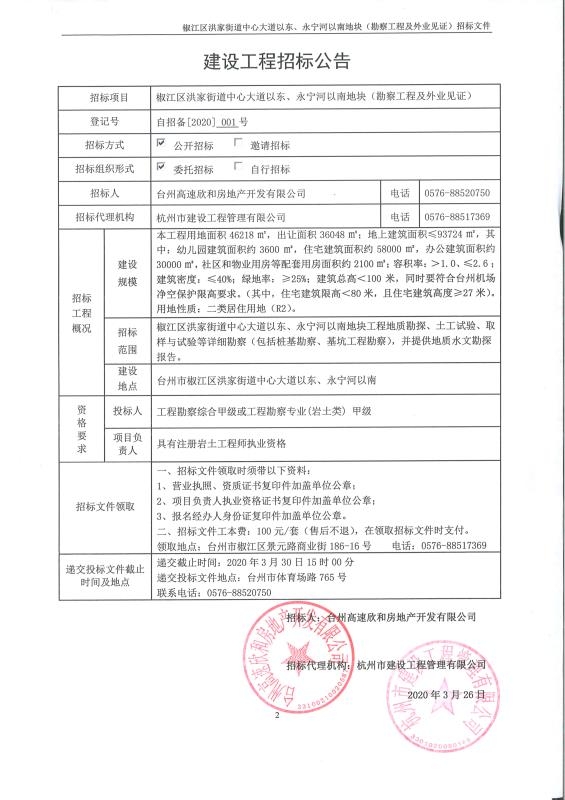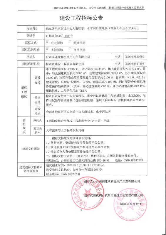 椒江區(qū)洪家街道中心大道以東、永寧河以南地塊(勘察工程及外業(yè)見證)工程招標(biāo)公告