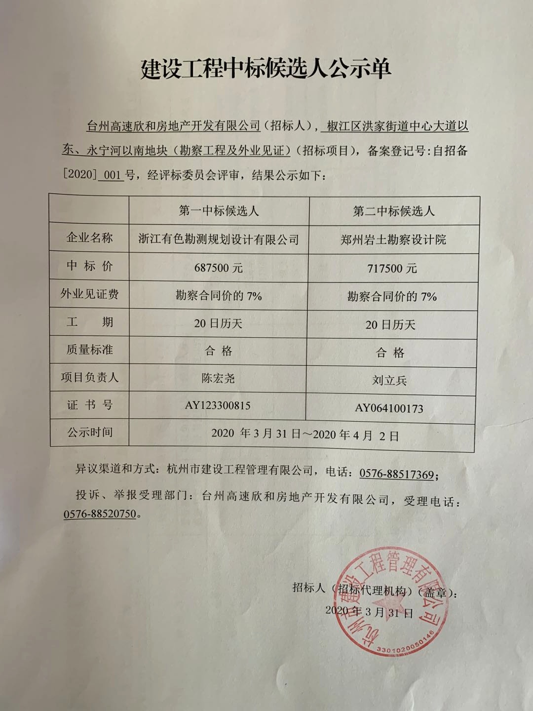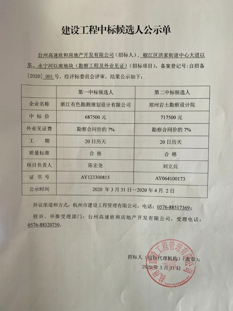 椒江區(qū)洪家街道中心大道以東、永寧河以南地塊(勘察工程及外業(yè)見(jiàn)證)(招標(biāo)項(xiàng)目)中標(biāo)候選人公示單