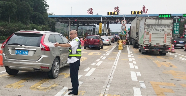 節(jié)日期間,車流量比往日多很多,每天多次出現(xiàn)長(zhǎng)時(shí)間大分流,一遇上高峰期車輛源源不斷地從各個(gè)方向匯聚在此,容易造成內(nèi)外廣場(chǎng)堵車。臨海南收費(fèi)所車輛雖多,但該站所出口秩序井然,未出現(xiàn)擁堵現(xiàn)象。瞧!這位在車流中,身著反光背心在這場(chǎng)大車流中,揮舞著雙臂指揮著交通,讓飛馳的車輛通過(guò)客貨分離,有效降低客貨車隨意串道,達(dá)到快速放行的四班班長(zhǎng)楊俊輝。