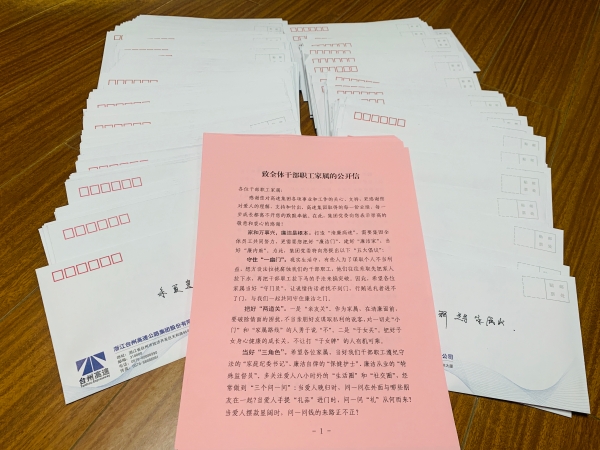 6月18日,集團(tuán)緊貼廉政教育月活動(dòng)要求,將“致全體干部職工家屬的公開信”交到每一名職工手中,這種家書形式廣泛宣傳廉潔清正的重要性,呼吁他們爭(zhēng)當(dāng)反腐倡廉的“廉內(nèi)助”。